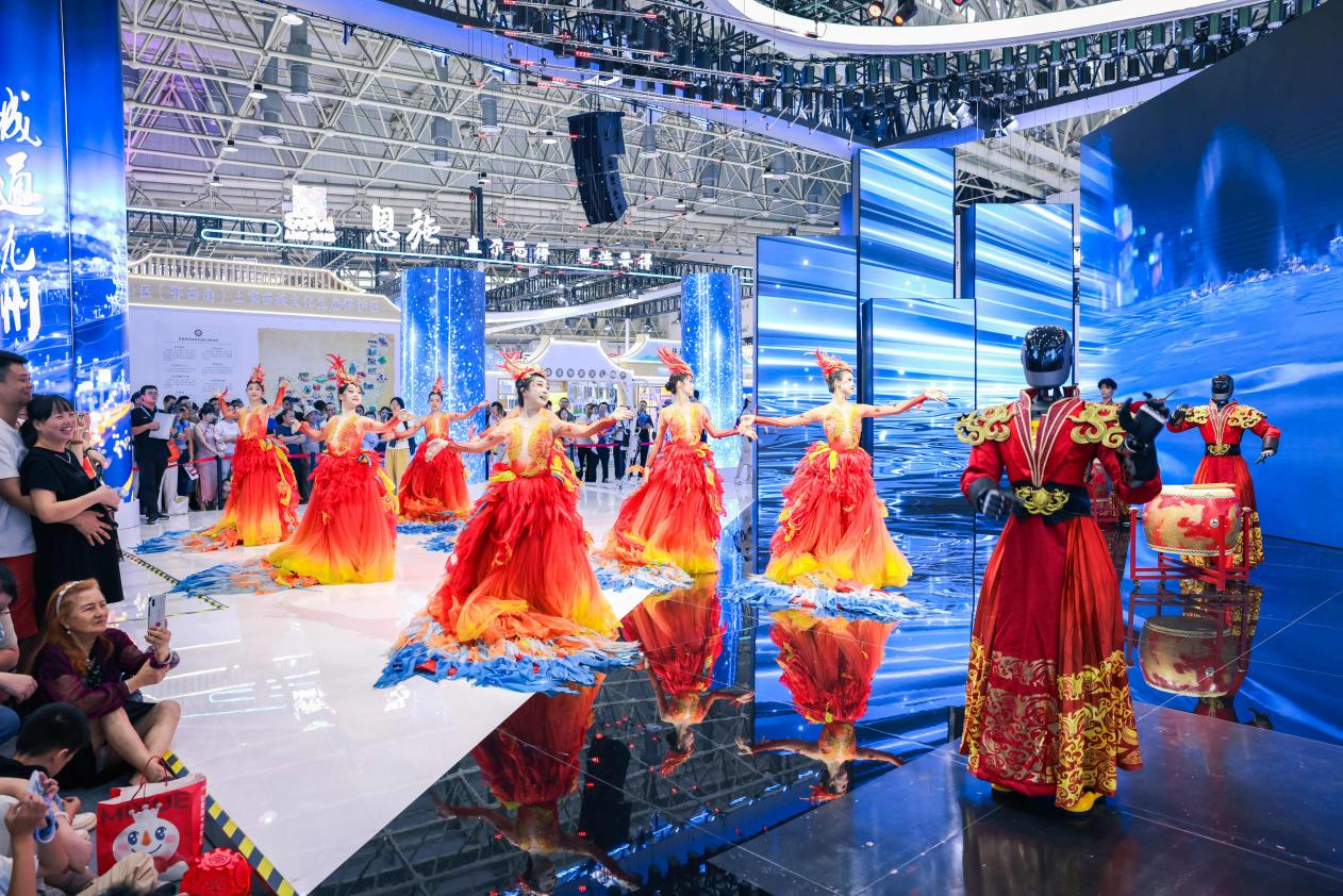 在展館內(nèi)外可以看到,各展區(qū)人頭攢動(dòng),在廣東長(zhǎng)隆展區(qū),兩點(diǎn)半的演出還沒(méi)開(kāi)始,人流已經(jīng)里三層外三層打圍。伴著強(qiáng)勁律動(dòng),外籍演員們還邀請(qǐng)觀眾共舞互動(dòng),現(xiàn)場(chǎng)氣氛爆棚。展館內(nèi)部,韓國(guó)館、陜西館等展位的熱舞、非遺展演成了焦點(diǎn)。多種多樣的智能設(shè)備體驗(yàn)等,更成為小朋友的樂(lè)園。