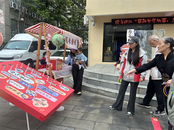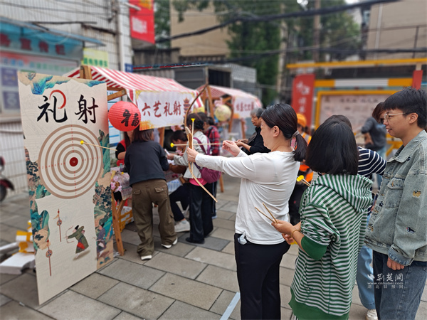 游戲互動區(qū)氛圍熱烈?!吧涓膊轮i”攤位前,居民踴躍參與,猜中謎底者可獲贈汪玉霞蘇月餅;“投壺納?!蔽娙艘辉嚿硎?,在趣味中感受古禮韻味;“福來套圈”則準備了洗衣液、透明皂等實用獎品,深受居民喜愛。此外,“六藝禮射”項目讓居民親身體驗傳統(tǒng)射藝,在拉弓搭箭間感受古人的尚武精神與禮儀風范。