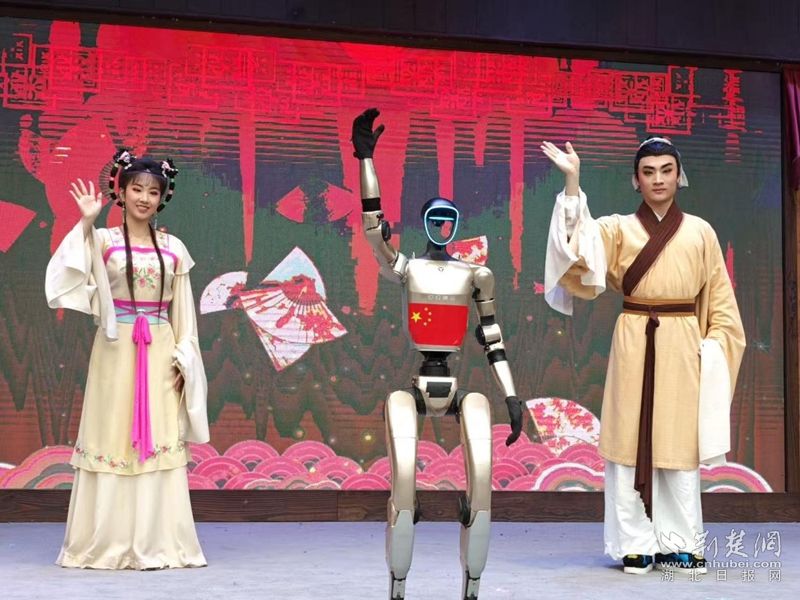 荊楚網(wǎng)(湖北日報網(wǎng))訊(通訊員王晶、費留燦)國慶中秋假期,在黃梅縣東山問梅村,當黃梅戲《女駙馬》的經(jīng)典唱段響起,機器人踩著婉轉(zhuǎn)唱腔靈活擺臂、轉(zhuǎn)身,復(fù)刻戲曲身段的韻味;戲腔未落,身著傳統(tǒng)獅頭裝扮的機器狗躍至臺前,跟著鼓點騰躍撲閃,鬃毛翻飛間盡顯靈動,引得游客紛紛舉手機拍攝,鏡頭緊追這些“特殊演員”。