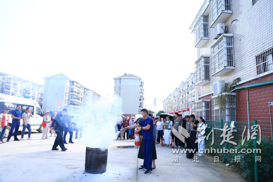 廣場一側(cè),先由湘口街道專職消防隊帶來一場沉浸式防災(zāi)減災(zāi)知識課。消防隊員就滅火器的性能、用途、使用方法、設(shè)備維護等基本知識進行講解,對如何正確使用消防栓、鋪設(shè)水帶進行了展示,著重講解了滅火器“一搖、二對、三撥、四壓”的操作技巧和注意事項,并指導(dǎo)社區(qū)居民進行滅火器實操演練?!耙郧坝X得滅火器操作很難,掌握技巧一點不難!”參加實操的居民李大爺說道。