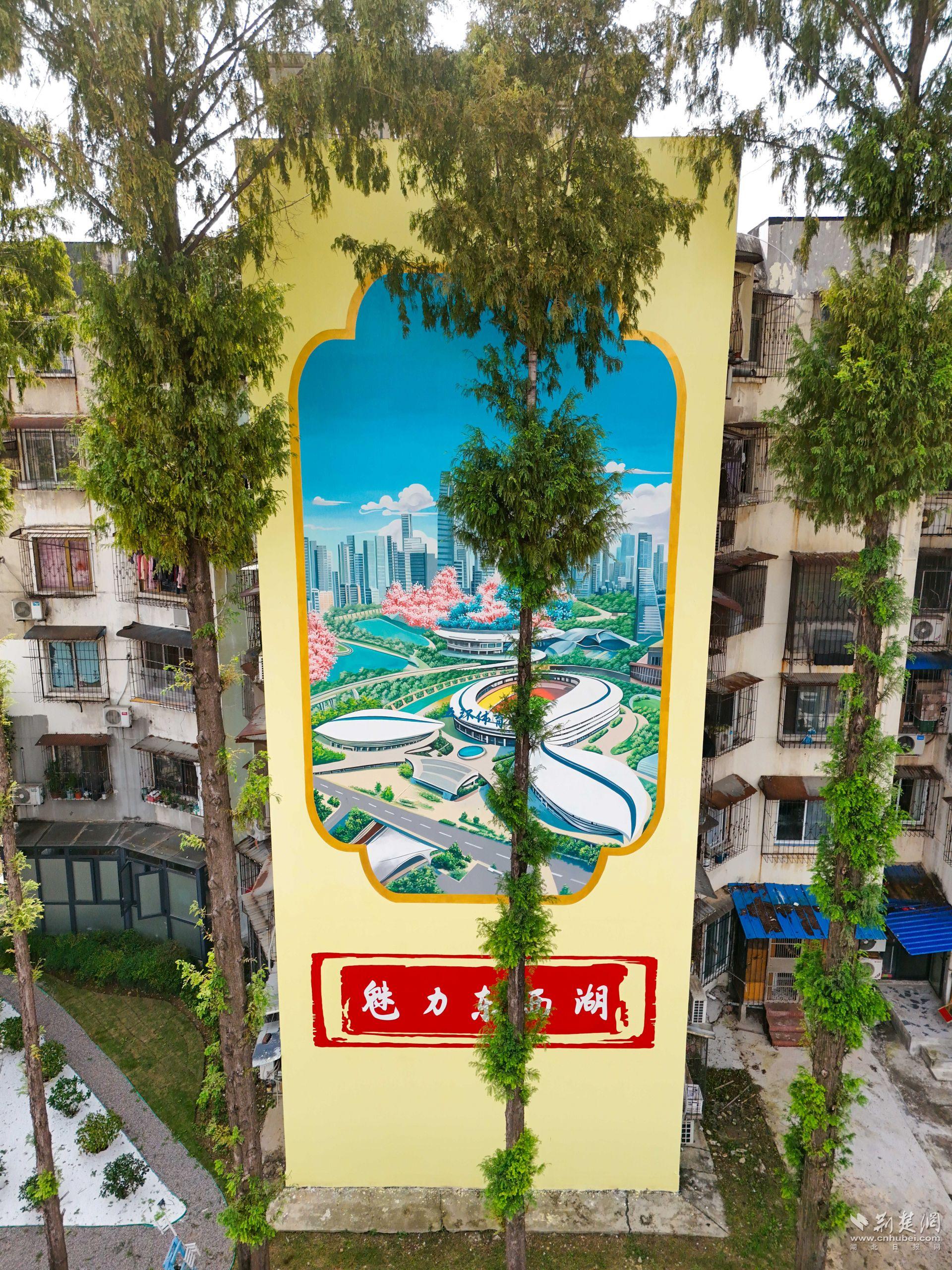 圍墻和彩繪也成了亮點。專業(yè)團隊在相鄰居民樓外墻繪制325平方米主題壁畫——一面呈現(xiàn)“魅力東西湖”的城市風(fēng)貌,一面展現(xiàn)“幸福新常青”的生活圖景,成為社區(qū)新地標。