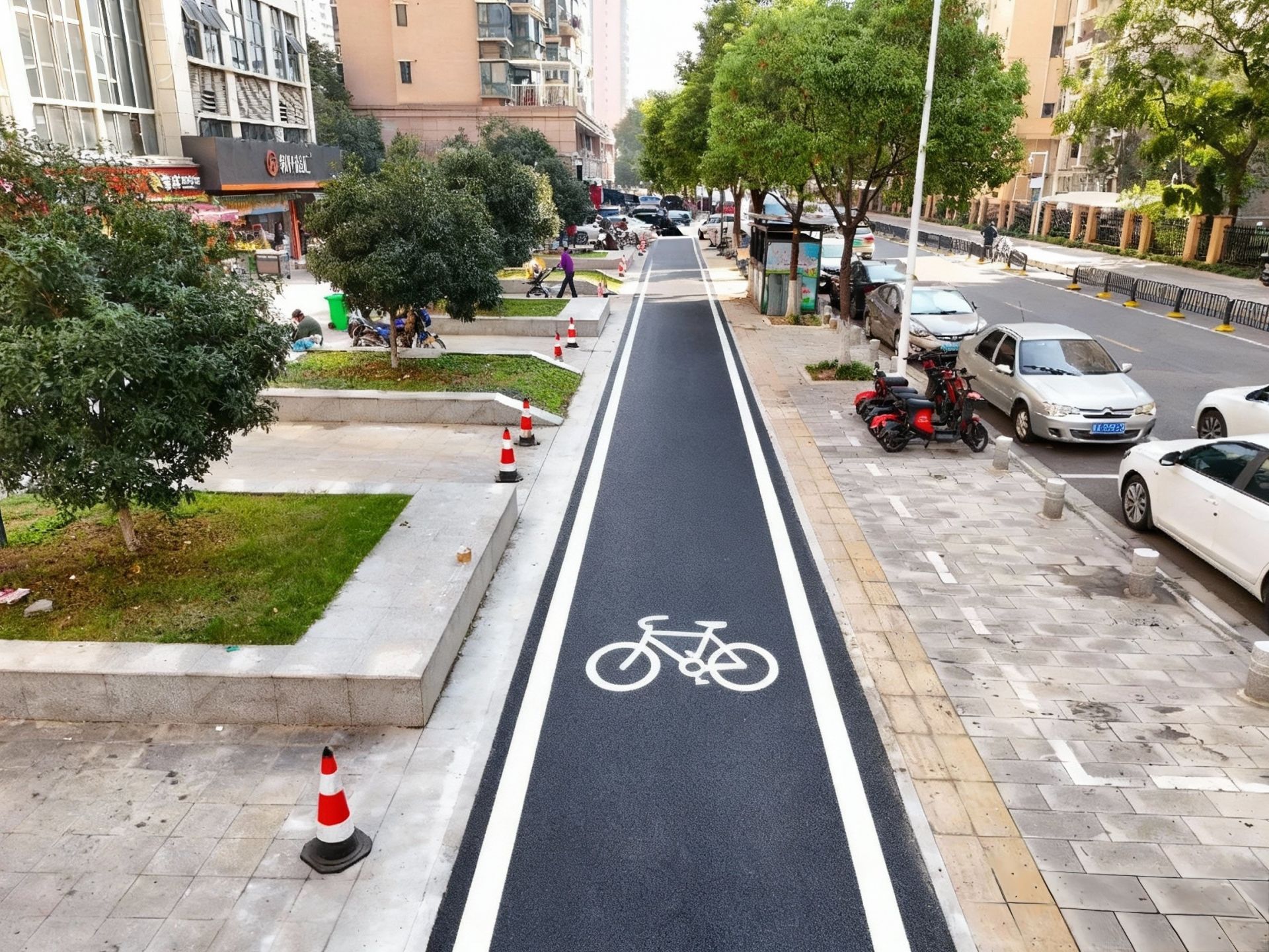 路面平整之后,還劃上了清晰的非機(jī)動(dòng)車道標(biāo)線,人車分流,騎行、步行互不干擾。同時(shí),為了防止機(jī)動(dòng)車占道,沿線還加設(shè)了8處阻車樁,機(jī)動(dòng)車再也不能“霸占”人行道了。