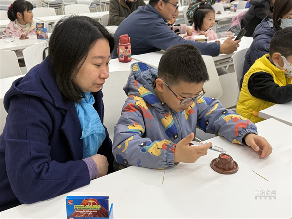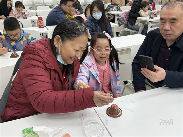 為讓抽象原理更直觀,活動(dòng)設(shè)置模擬火山噴發(fā)實(shí)驗(yàn)環(huán)節(jié)?,F(xiàn)場(chǎng)備好黏土火山模型、小蘇打、白醋等物料,容東林一邊操作一邊講解:向“巖漿腔”倒入小蘇打并加紅色素,再注入白醋,紅色“巖漿”瞬間噴涌而出,引得居民驚嘆、孩子們目不轉(zhuǎn)睛。他引導(dǎo)大家觀察全過程,深入淺出解釋酸堿反應(yīng)原理及火山灰對(duì)生態(tài)環(huán)境的影響,還邀請(qǐng)孩子們近距離體驗(yàn),激發(fā)科學(xué)探索興趣。