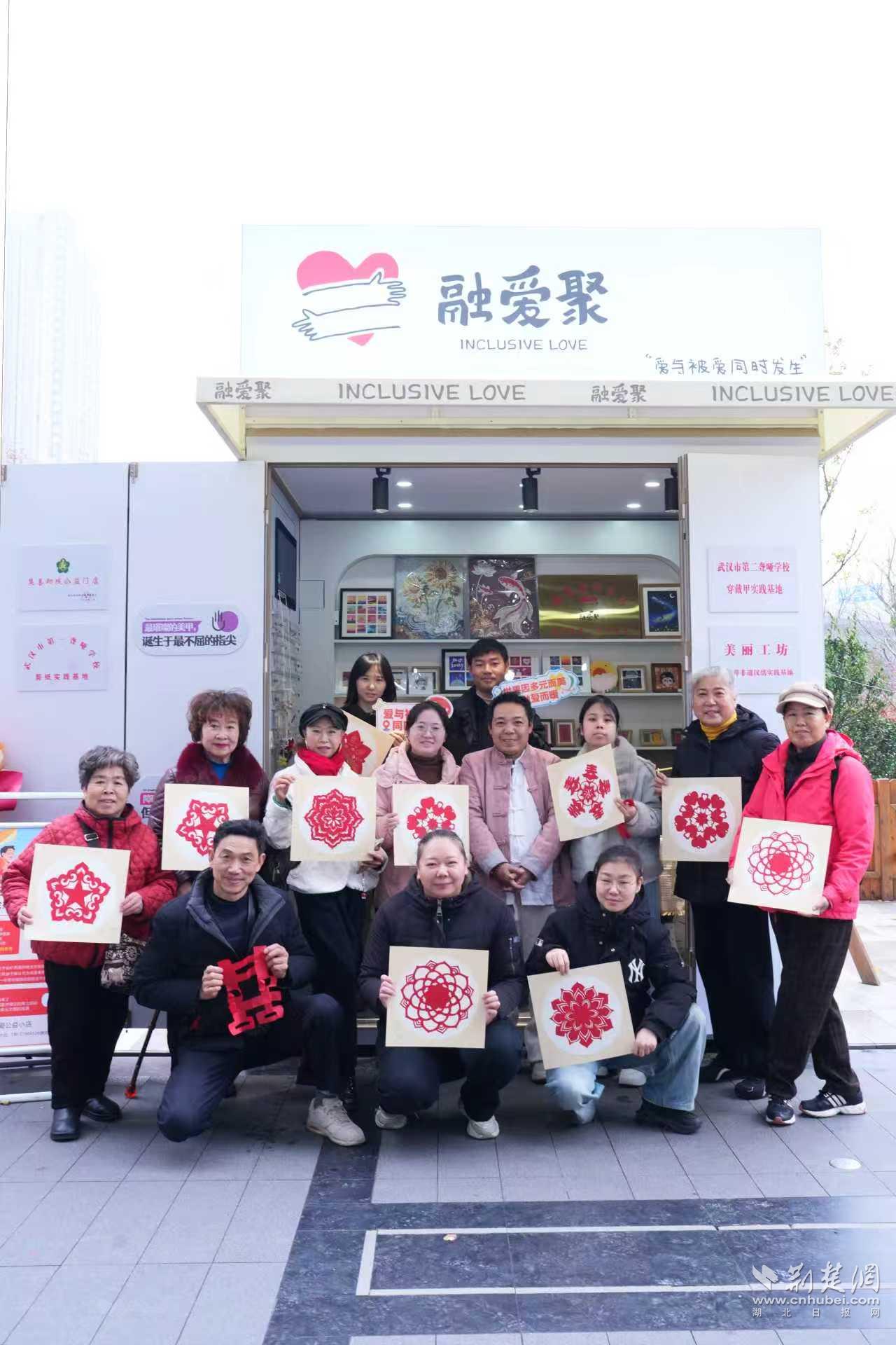 活動當(dāng)天,武漢剪紙非遺傳承人、湖北省工藝美術(shù)大師葛?,F(xiàn)場展示并手把手教授以“融愛萬家”為主題的剪紙作品。來自黃陂“美麗工坊”的朱熙老師也帶來了編繩技藝,與居民面對面交流。