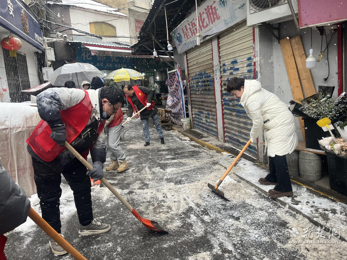 當(dāng)天清晨,清雪人員已在轄區(qū)出行要道、社區(qū)小巷等多個(gè)點(diǎn)位同步作業(yè)。街道機(jī)關(guān)干部帶隊(duì)下沉一線,來自轄區(qū)的多支力量陸續(xù)到位。江漢區(qū)科學(xué)技術(shù)協(xié)會(huì)、區(qū)湖泊管理所等單位黨員積極參與行動(dòng);新華路體育中心、南國中心等單位也主動(dòng)對接,紛紛派出人員和工具協(xié)同作業(yè)。
