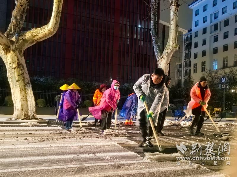 20日凌晨30分,武昌區(qū)中華路街道迅速組織力量,街道、轄區(qū)應急分隊、環(huán)衛(wèi)工人、物業(yè)以及社區(qū)志愿者等80余人,連夜對中華路、解放路、民主路、都府堤路等重要干道展開連夜作業(yè);凌晨5時,洪山區(qū)執(zhí)法中心組織力量對文治街、書城路沿線長達1.2公里的人行道展開"地毯式"清障,累計清除積雪積冰約2000平方米;早上6時,江岸區(qū)花橋街道380余人的除雪隊伍集中對校園周邊、小區(qū)出入口、主干道人行道的積雪進行重點清掃,累計清理積雪約0.8噸。