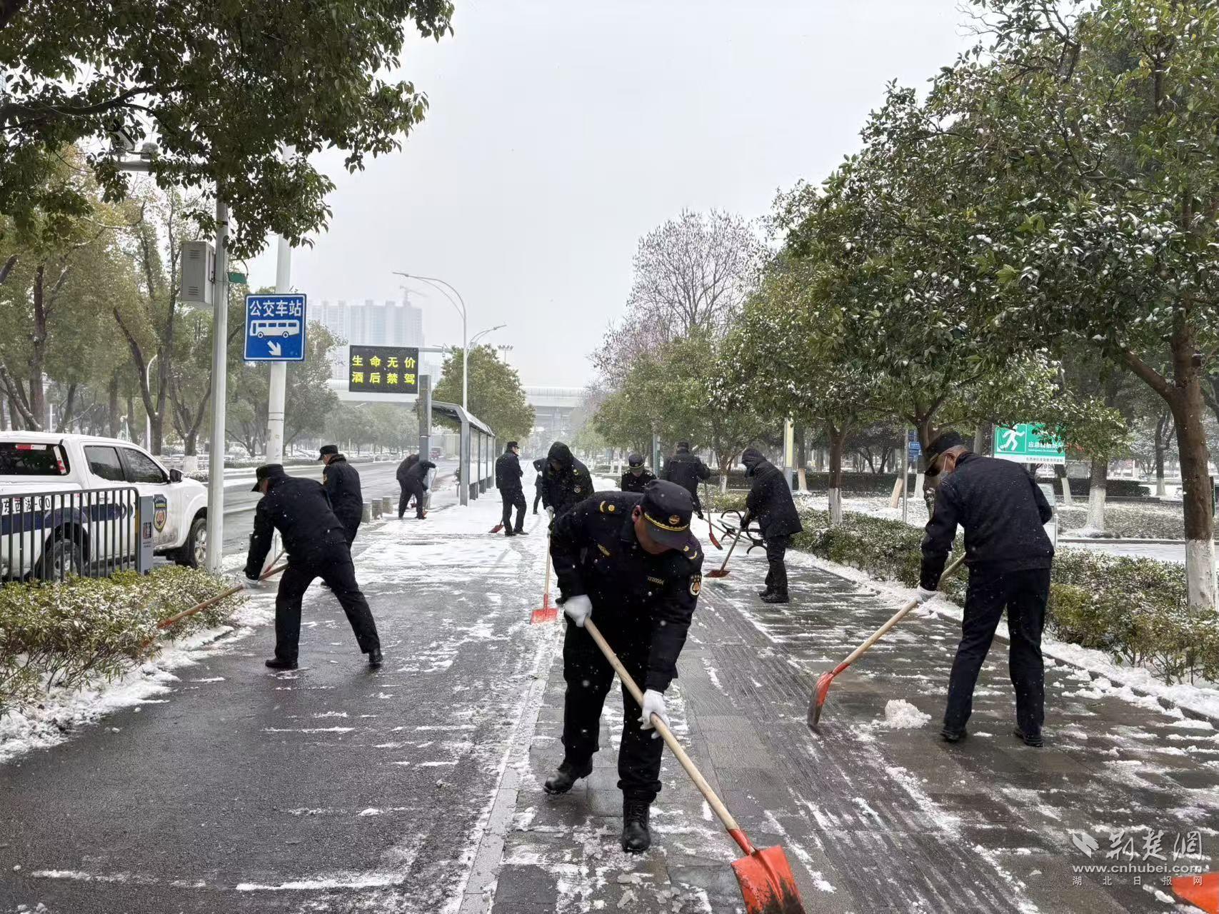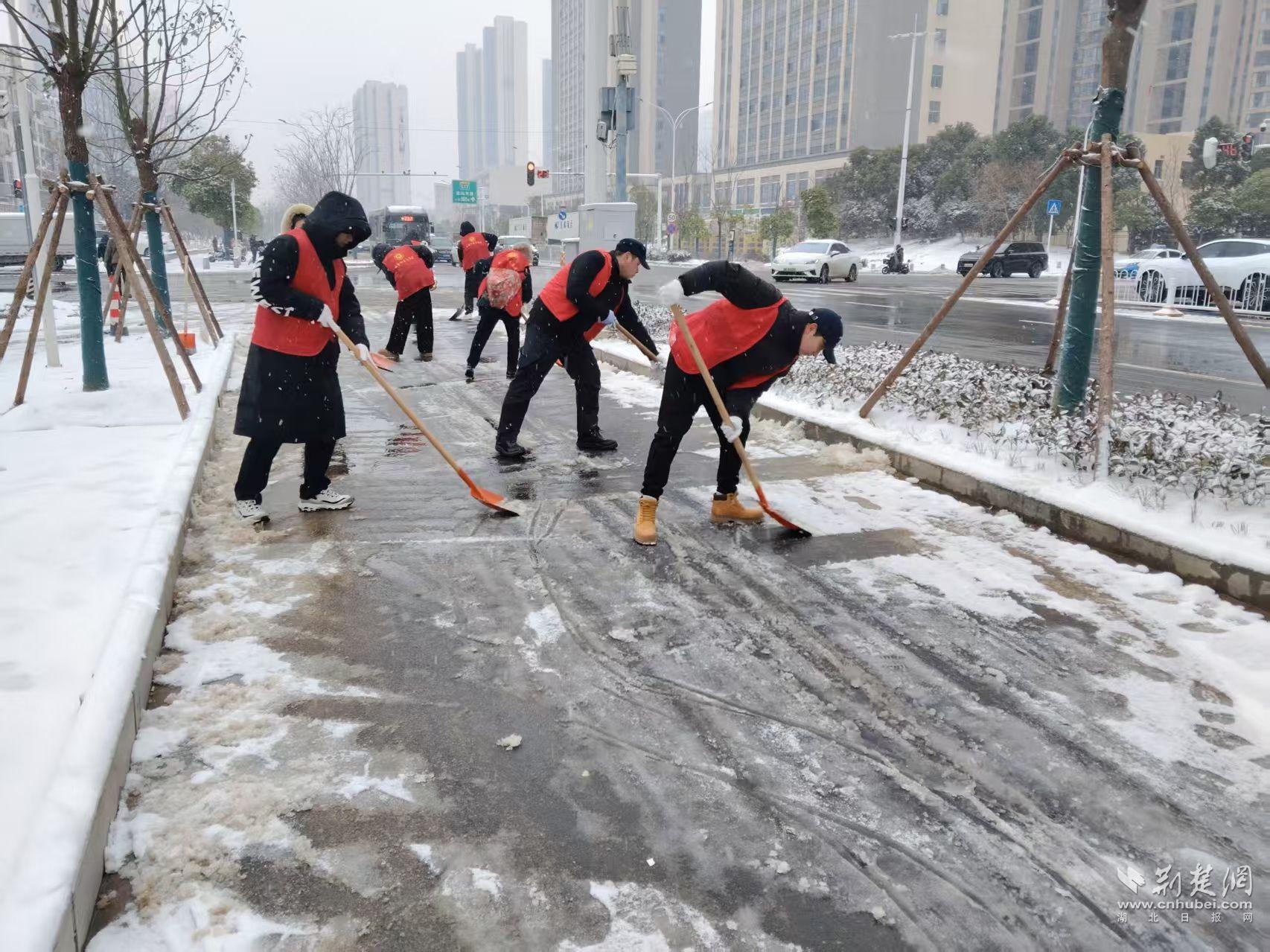 寒風(fēng)雖冷,熱情不減。鐵鍬鏟冰聲、掃帚掃地聲格外清晰。湖北廣電的老黨員張??钙痂F鍬,帶頭干起來?!拔覀冏ゾo鏟!路通了,大家上班、上學(xué)、買菜才安心。”他邊干邊說。家住二十四城的居民尹作意也不甘示弱,三葉士林的青年職工劉貝表示:“能為大家出把力,心里暖和?!痹谏鐓^(qū)書記潘飛飛的帶領(lǐng)下,大家3個(gè)小時(shí)連續(xù)作戰(zhàn),成功清除了沿線3公里人行道的積雪。