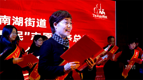 活動的另一重頭戲,是“了不起的居民”志愿服務總隊的成立儀式。在區(qū)委社會工作部部長謝琬宣讀成立文件后,區(qū)委副書記、統(tǒng)戰(zhàn)部部長劉海停上臺為總隊隊長張淑靜授旗,標志著南湖街道近300支活躍的志愿服務隊伍,有了統(tǒng)一的旗幟與核心。
