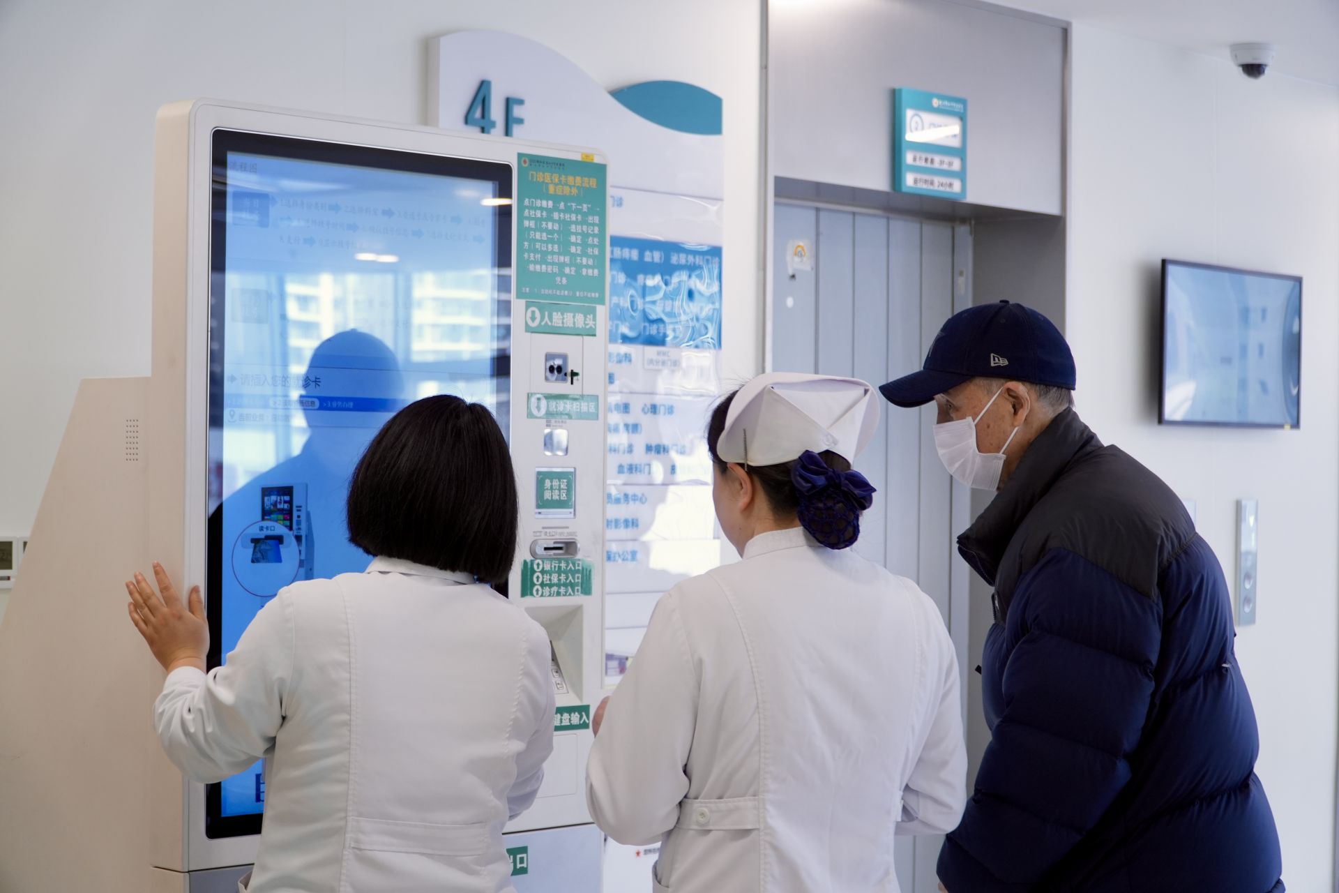 進(jìn)入門診大廳,導(dǎo)診臺(tái)、自助掛號(hào)機(jī)分布在顯眼位置。記者注意到,多名醫(yī)護(hù)人員和志愿者在大廳內(nèi)來回巡查,看到行動(dòng)不便的老人,便主動(dòng)上前詢問,幫忙完成掛號(hào)等流程,就診秩序平穩(wěn)有序。