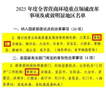 近日,湖北省優(yōu)化營商環(huán)境領導小組對2025年度全省優(yōu)化營商環(huán)境重點領域改革事項及成效明顯地區(qū)進行通報表揚。其中,黃陂政務服務領域兩項創(chuàng)新改革納入國家部委試點,獲國家有關部門肯定,彰顯區(qū)域改革擔當與服務實力。