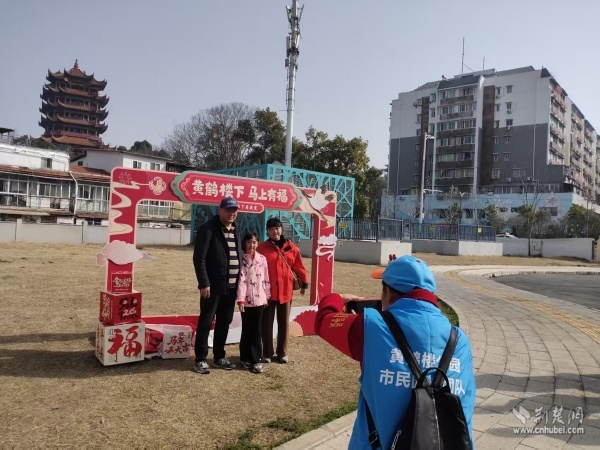 幫游客與黃鶴樓合影。 通訊員供圖