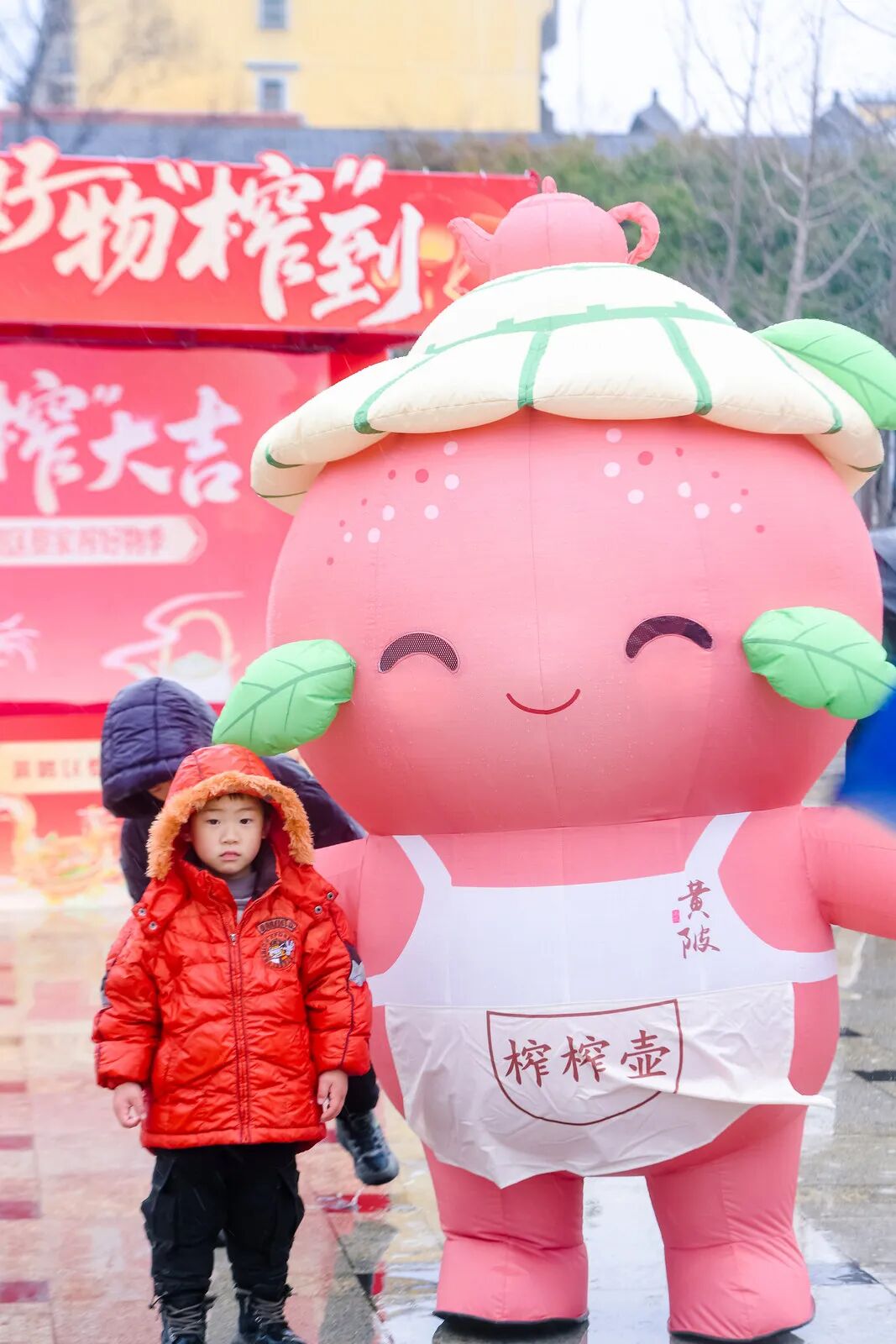 ? 小朋友在活動(dòng)現(xiàn)場與榨榨壺合影。