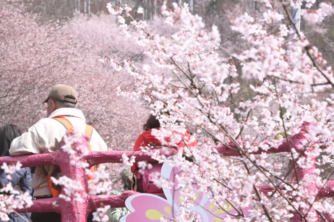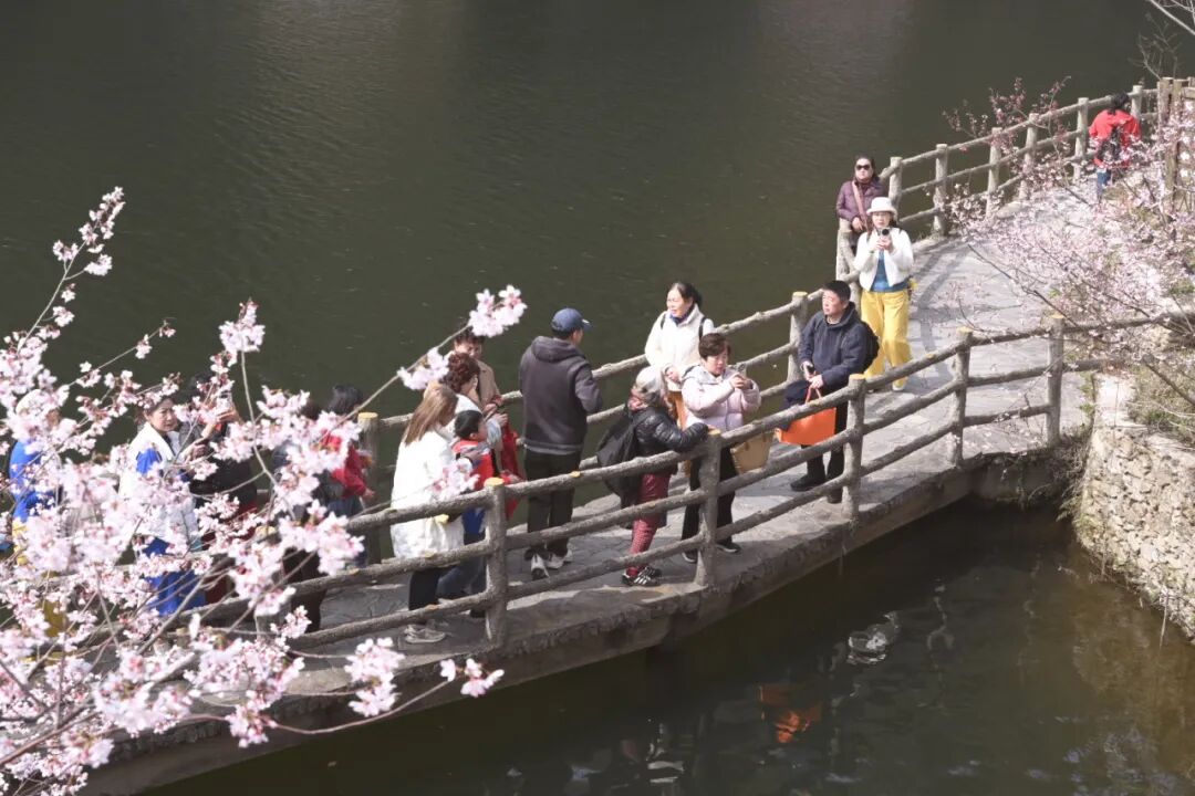 步入景區(qū),綿延道路兩側櫻花成廊,花枝交錯如云似霞。層層花瓣在陽光下熠熠生輝,粉白相間、隨風輕搖,勾勒出如夢似幻的春日盛景。游客們漫步其間,拍照打卡、駐足欣賞,在山野間沉浸式感受櫻花與春光的雙重浪漫。