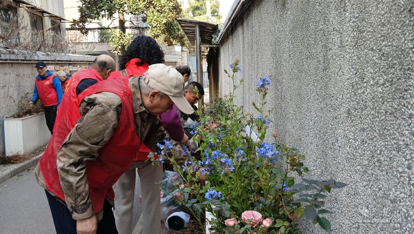 活動(dòng)當(dāng)天,50余名參與者分成修剪組、除草組、施肥組、補(bǔ)種組,各組各司其職,協(xié)同作戰(zhàn)。修剪組的成員手持剪刀、鋸子,仔細(xì)為綠植清除枯枝和病枝,讓樹形更加規(guī)整舒展;除草組則俯身彎腰,清理綠化帶內(nèi)的雜草雜物;施肥組精準(zhǔn)施撒有機(jī)肥,為綠植生長(zhǎng)注入養(yǎng)分;補(bǔ)種組成員在黃土裸露區(qū)域挖坑、栽苗、培土、澆水,將一株株月季、杜鵑等花卉苗木植入土壤,豐富景觀層次。經(jīng)過一上午的辛勤勞作,先賢街沿線的綠化面貌煥然一新,新補(bǔ)植的月季、杜鵑迎風(fēng)而立,新翻的泥土氣息與花香交織,為老街增添了盎然生機(jī)。