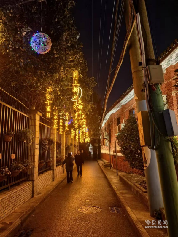 這個(gè)由社區(qū)與共建單位湖北省農(nóng)業(yè)事業(yè)發(fā)展中心共同策劃改造的“詩詞長廊”,創(chuàng)新融合了詩詞文化與光影藝術(shù)。夜幕降臨,一盞盞詩詞燈帶悄然亮起。柔和光暈下,“晴川歷歷漢陽樹,芳草萋萋鸚鵡洲”的古韻與墻上“蒜鳥”“七飯”等俏皮的武漢方言點(diǎn)綴其間,歷史與當(dāng)下在光影交錯(cuò)間完成了隔空對話。