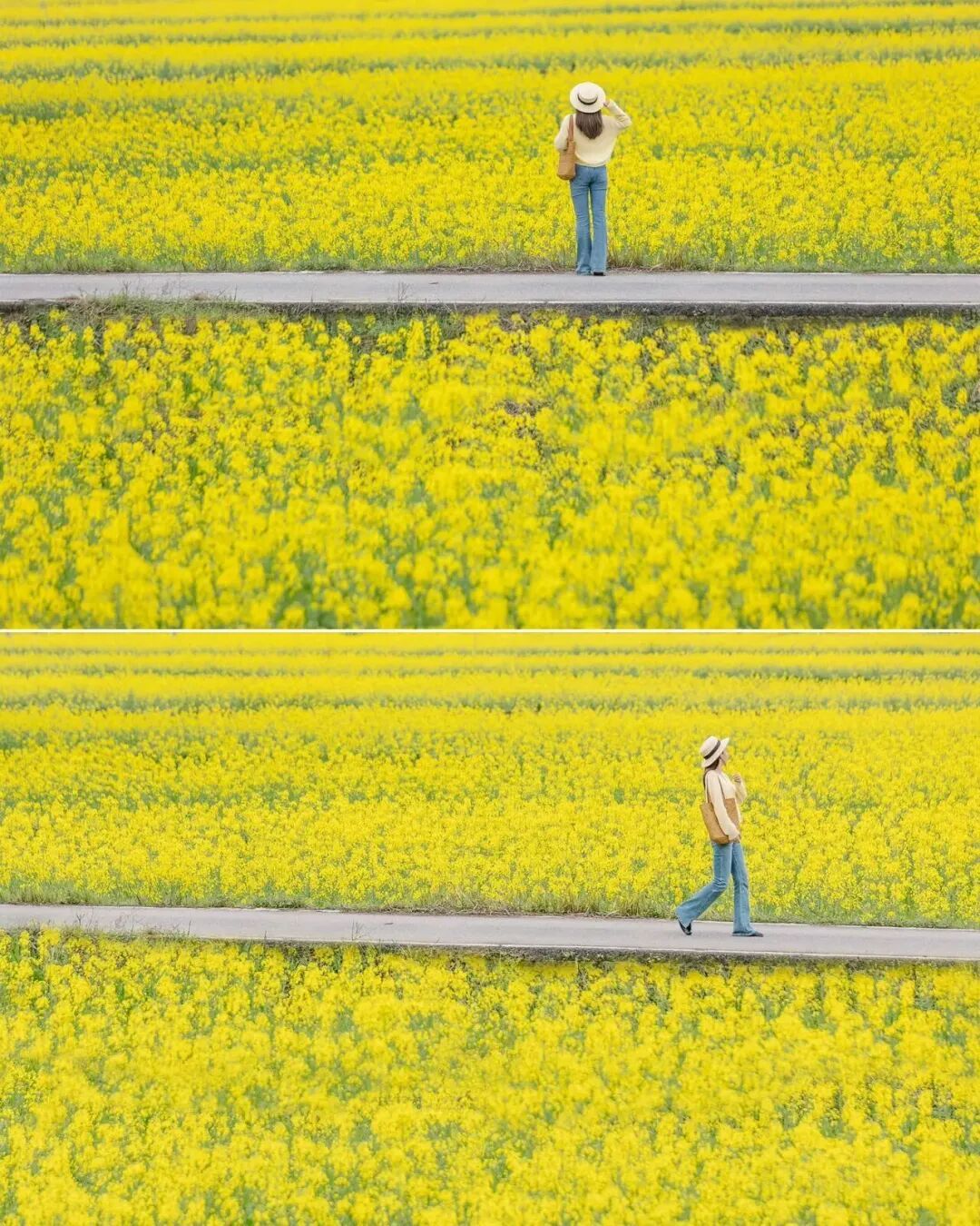??除了郁金香,100多畝油菜花田也正值盛花期,金黃的波浪隨風(fēng)起伏,和遠(yuǎn)處的青山、白墻黛瓦的村落相映成趣,妥妥的「治愈系田園風(fēng)」天花板。