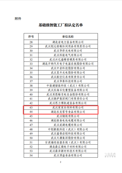 荊楚網(wǎng)(湖北日報網(wǎng))訊(通訊員 曾靜子 范漫 望亞男)近日,武漢市經(jīng)濟和信息化局發(fā)布《關(guān)于2026年基礎(chǔ)級智能工廠擬認(rèn)定名單的公示》。經(jīng)企業(yè)自主申報、各區(qū)推薦及市級復(fù)核等程序,湖北農(nóng)發(fā)集團旗下武漢家家樂飼料有限公司與湖北農(nóng)發(fā)零號食品有限公司成功入選。本次全市共有57家單位獲得認(rèn)定,兩家子公司位列其中。