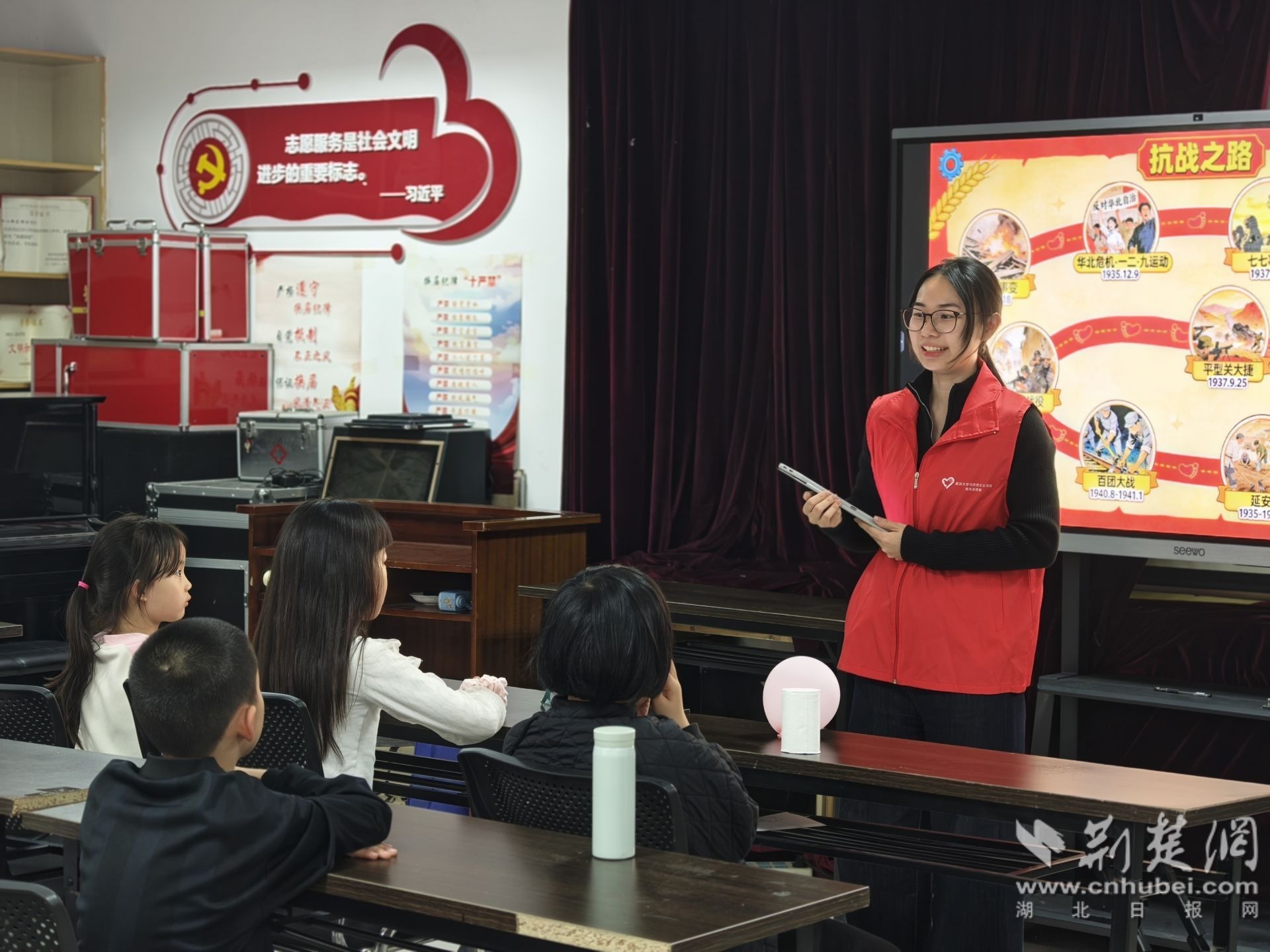 荊楚網(wǎng)(湖北日報網(wǎng))訊(通訊員 曼晶晶)近日,武昌區(qū)珞珈山街道東湖村社區(qū)聯(lián)合武漢大學馬克思主義學院青年志愿者協(xié)會開展了“抗戰(zhàn)烽火·英雄征途”紅色課程,以沉浸式知識闖關(guān)形式,帶領(lǐng)社區(qū)兒童重溫抗戰(zhàn)崢嶸歲月,讓紅色故事浸潤童心,讓英烈精神照亮成長之路。
