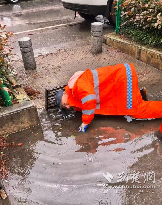 在街道的主次干道上,一群“橙色身影”同樣在風雨中逆行。晨曦路、康泰路沿線,雨水裹挾著落葉、淤泥和塑料袋涌入雨水井,排水口頻頻告急。湘口街環(huán)衛(wèi)中心20名作業(yè)人員頂風冒雨,對40余處井蓋展開緊急清淤。黨齡32年的彭新山俯身徒手掏挖的身影格外引人注目。他半跪在積水中,手持鐵鉤撬開井蓋,直接探進胳膊一把把掏出堵塞的枯枝爛葉,泥漿濺滿臉身也渾然不顧?!斑@個口子堵得厲害,不掏干凈路面積水下不去,老百姓走路、開車都危險。”