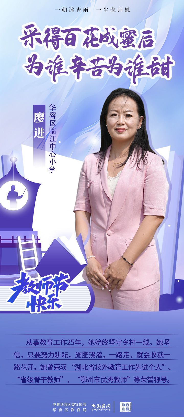荊楚網(wǎng)(湖北日報網(wǎng))訊(記者 劉璐 通訊員 張曉琴)百年大計,教育為本;教育大計,教師為本。在教師節(jié)來臨之際,中共華容區(qū)委宣傳部聯(lián)合荊楚網(wǎng)(湖北日報網(wǎng))推出創(chuàng)意海報,姜海燕、廖進等6名老師入選“荊楚好老師”群星計劃。她們?彰顯了新時代教師的風采,?為教育事業(yè)的發(fā)展貢獻了重要力量?,向了不起的她們致敬!