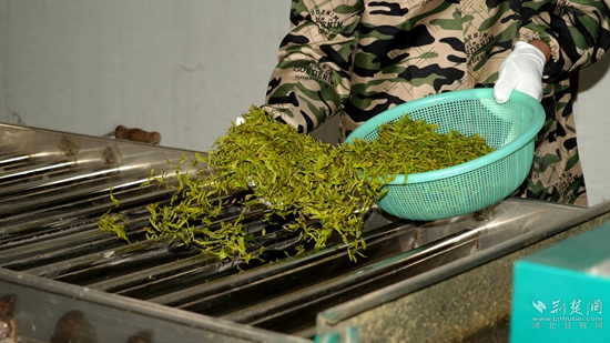 “我們現(xiàn)在是茶葉豐收期,所以我們生產(chǎn)車間都是24小時(shí)運(yùn)轉(zhuǎn),工人都是三班倒,確保每天能產(chǎn)干茶600多斤?!?蘄春蟹子地茶業(yè)有限公司總經(jīng)理吳風(fēng)長高興道。
