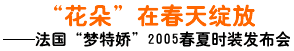 2005年4月5日,源自“時尚之都”巴黎的經(jīng)典法國時裝品牌夢特嬌,于春天伊始在武漢香格里拉大飯店上演一場激情四溢的時尚秀。在夢特嬌春夏時裝武漢發(fā)布會上,設(shè)計師們將經(jīng)典、動感和優(yōu)雅融入夢特嬌最新春夏亮絲時裝系列,將現(xiàn)代經(jīng)典、都市休閑魅力、動感動力、永恒經(jīng)典和瑰麗高雅五大主題一一呈現(xiàn)。而那最負盛名的“花朵”標(biāo)志,則仿若今春最絢爛綻放的花朵,在展示臺上奏出一支“春天的圓舞曲”。