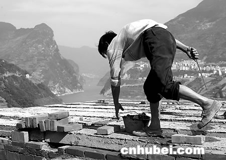 (圖1)西陵峽兵書寶劍峽口,村民正忙著蓋新樓房。 (圖2)一名兒童在已拆得面目全非的房屋前玩耍。 (圖3)奉節(jié)老城開濟(jì)門城墻如今只剩殘垣斷壁。 (圖4)祖孫倆坐在云陽老縣城二期水位標(biāo)牌前。 (圖5)奉節(jié)縣居民在新縣城百米速寫畫墻上覓舊城蹤影。 (圖6)萬州老城最繁華的勝利街只留下了指示路牌。 ______________________________________________________