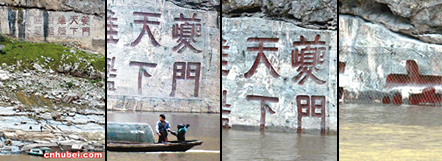 昨日上午,瞿塘峽夔門摩崖題刻中的“踏出夔巫打走倭寇”字開始沒入江中。夔門摩崖題刻頂端的水位線是126米,蓄水完后,這些字跡會被全部淹沒。當(dāng)?shù)夭块T已對這些文物進(jìn)行了保護(hù)。 湖北日報記者周立新攝