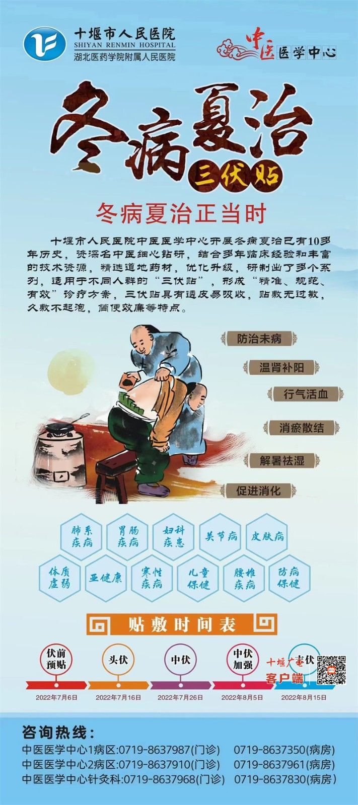 陳峰主任特別提醒:“三伏”穴位貼敷4次為一個(gè)療程,一般需連續(xù)貼敷3年至5年。每次貼敷時(shí)長(zhǎng)2小時(shí)為宜,皮膚敏感者及兒童根據(jù)皮膚耐受程度應(yīng)縮短貼敷時(shí)間,有發(fā)熱、皮膚潰破、體質(zhì)特別虛弱及患有糖尿病及瘢痕體質(zhì)人群幾類(lèi)疾病人群,不適宜貼敷三伏貼,同時(shí)貼敷三伏貼,應(yīng)在醫(yī)師指導(dǎo)下進(jìn)行貼敷,貼敷過(guò)程中,飲食要注意清淡,避免受風(fēng)受涼。
