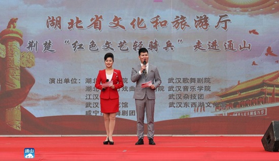 云上通山訊(通訊員 鄧文義 鄧娜)暖風(fēng)和煦,遍地芬芳,最美人間四月天。4月11日,由省文化和旅游廳主辦,省文化活動(dòng)策劃中心、咸寧市文化和旅游局共同承辦的“荊楚‘紅色文藝輕騎兵’文化扶貧”大型文藝演出走進(jìn)板橋村,給村民奉上了一頓豐盛的文化大餐。省紀(jì)委派駐省文化和旅游廳紀(jì)檢監(jiān)察組組長(zhǎng)、黨組成員陳鍇,市委副秘書長(zhǎng)、省紀(jì)委駐通山工作隊(duì)隊(duì)長(zhǎng)、副縣長(zhǎng)胡長(zhǎng)學(xué),縣委常委、紀(jì)委書記、監(jiān)委主任劉海元,縣委常委、宣傳部長(zhǎng)吳柏林觀看演出。
