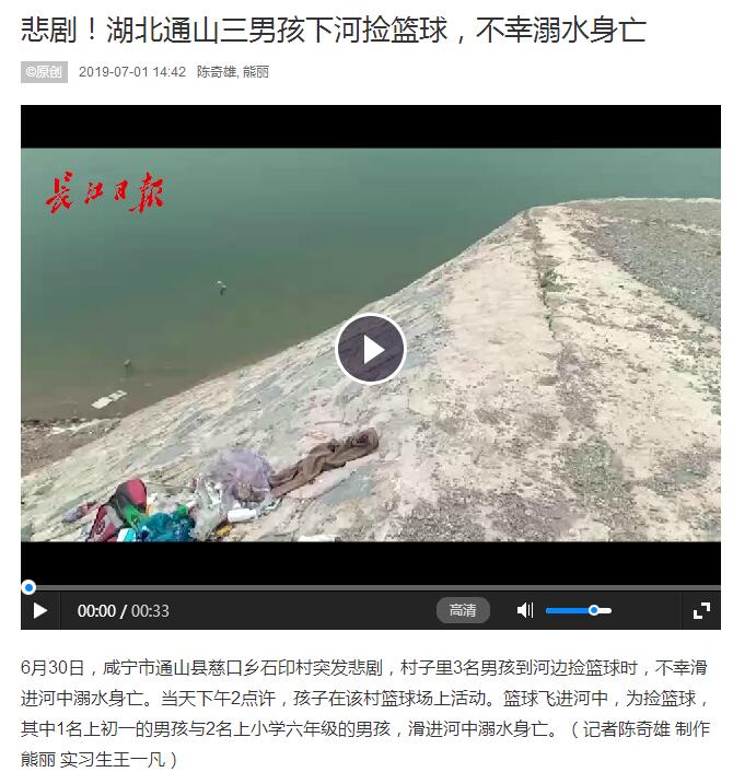 6月30日,咸寧市通山縣慈口鄉(xiāng)石印村突發(fā)悲劇,村子里3名男孩到河邊撿籃球時(shí),不幸滑進(jìn)河中溺水身亡。當(dāng)天下午2點(diǎn)許,孩子在該村籃球場(chǎng)上活動(dòng)。籃球飛進(jìn)河中,為撿籃球,其中1名上初一的男孩與2名上小學(xué)六年級(jí)的男孩,滑進(jìn)河中溺水身亡。(記者陳奇雄 制作 熊麗 實(shí)習(xí)生王一凡)