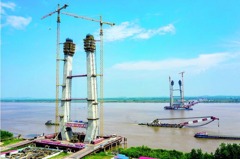 8月21日,赤壁長江大橋正在進行南北主塔中塔柱施工,南北主塔高度達到了133米,占總高度的60%左右。赤壁長江大橋連接赤壁市與洪湖市,主橋是雙塔雙索面斜拉結構,主塔為H形。承建單位中鐵大橋局在高溫天氣縮短白天施工時間,早晚補工,保障施工進度不因酷暑延后。預計明年2月能按期實現(xiàn)主塔封頂?shù)仁┕つ繕?。(視界網(wǎng) 馬海斌 攝)