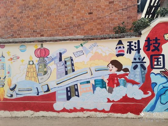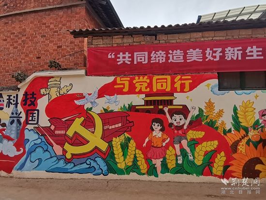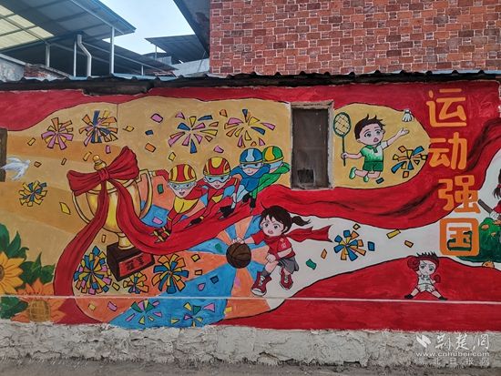 這面墻體上繪制了沐浴黨恩、運(yùn)動強(qiáng)國、生態(tài)文明、科技興國、與黨同行、向黨向未來六大主題,其中既有充滿活力、朝氣和正能量的向日葵、麥穗、綠樹等植物,又有熊貓、猴子、兔子、獅子等可愛的動物。