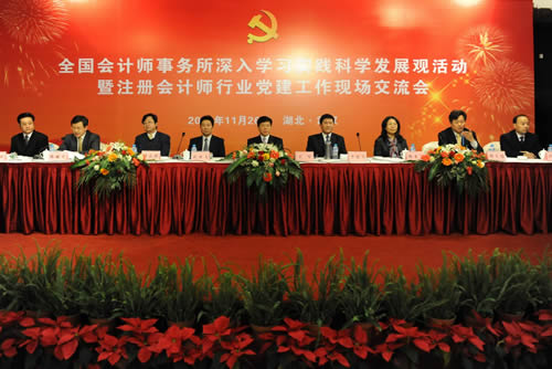 11月26日,財(cái)政部會(huì)計(jì)師事務(wù)所深入學(xué)習(xí)實(shí)踐科學(xué)發(fā)展觀活動(dòng)指導(dǎo)小組、中國注冊會(huì)計(jì)師行業(yè)黨委在湖北省武漢市召開全國會(huì)計(jì)師事務(wù)所深入學(xué)習(xí)實(shí)踐科學(xué)發(fā)展觀活動(dòng)暨注冊會(huì)計(jì)師行業(yè)黨建工作現(xiàn)場交流會(huì),深入學(xué)習(xí)貫徹黨的十七屆四中全會(huì)精神,總結(jié)各省市區(qū)會(huì)計(jì)師事務(wù)所學(xué)習(xí)實(shí)踐活動(dòng)和行業(yè)黨建工作做法,交流經(jīng)驗(yàn),探討方法,凝聚共識,更加扎實(shí)有效地推進(jìn)會(huì)計(jì)師事務(wù)所學(xué)習(xí)實(shí)踐活動(dòng)和行業(yè)黨建工作。財(cái)政部黨組成員、副部長、財(cái)政部會(huì)計(jì)師事務(wù)所深入學(xué)習(xí)實(shí)踐科學(xué)發(fā)展觀活動(dòng)指導(dǎo)小組副組長、中國注冊會(huì)計(jì)師行業(yè)黨委書記王軍,湖北省委常委、常務(wù)副省長李憲生出席會(huì)議并講話。