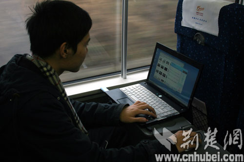 荊楚網(wǎng)記者在高速飛馳的和諧號(hào)列車上發(fā)稿