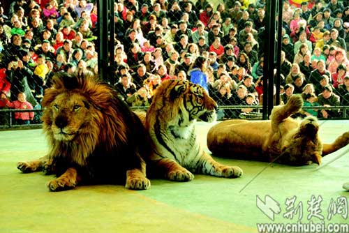 圖為:虎年最受追捧的當(dāng)屬武漢動(dòng)物園的“小虎隊(duì)”,表演場(chǎng)次較平時(shí)增加一倍。 記者劉茜通訊員何志華攝