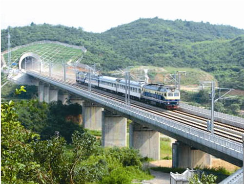 大瑤山位于湘粵交界之處,素有“南嶺險(xiǎn)關(guān)”之稱。上世紀(jì)80年代,修建衡陽到廣州復(fù)線,建設(shè)者用7年時(shí)間在這里修建隧道,全長(zhǎng)14公里,是當(dāng)時(shí)國(guó)內(nèi)最長(zhǎng)的雙線電氣化隧道。這次,武廣客專的方案是修建隧道群,由1號(hào)、2號(hào)、3號(hào)隧道組成,橋隧相連。3條隧道全長(zhǎng)25公里,用了3年半全部竣工。