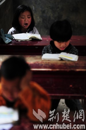 孩子們在艱苦的環(huán)境下晨讀。