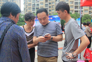 工作人員協(xié)助居民訂閱湖北手機(jī)報(bào)