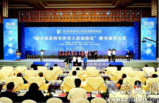 圖為:昨日上午,2016年“華創(chuàng)會(huì)”在武漢東湖國際會(huì)議中心開幕。圖為“湖北省政府華僑華人咨詢委員”聘書頒發(fā)儀式現(xiàn)場。...">