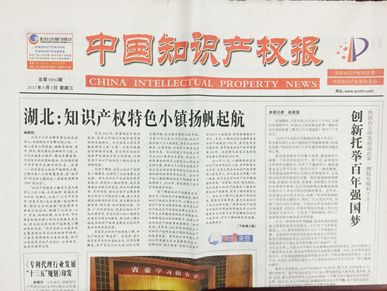 5月3日,中國知識(shí)產(chǎn)權(quán)報(bào)頭版頭條刊登了《湖北:知識(shí)產(chǎn)權(quán)特色小鎮(zhèn)揚(yáng)帆起航》的新聞,向百萬公眾報(bào)道了武漢岱家山知識(shí)產(chǎn)權(quán)特色小鎮(zhèn)。