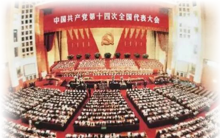 1992年10月12日至18日,中國共產黨第十四次全國代表大會在北京舉行。大會正式代表1989人,特邀代表46人,代表著全國5100多萬名黨員。大會選舉產生了由委員189人、候補委員130人組成的中央委員會和由委員108人組成的中央紀律檢查委員會。
